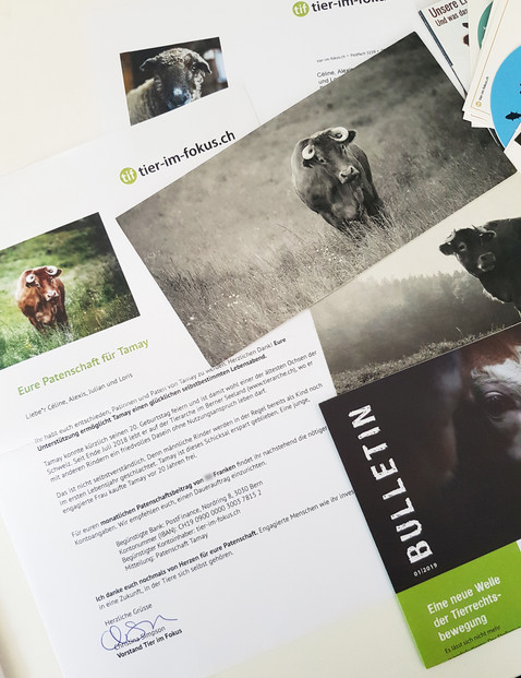 Les besoins en nourriture et en soins s’élèvent à CHF 250.- par mois par animal. Ce sont des marraines et parrains qui contribuent, en exclusivité ou partiellement, à hauteur de leurs moyens (généralement dès 25.- par mois), à l’entretien des animaux, via l’association Tierarche Seeland mais aussi Tier im Fokus (TIF), dont trois animaux sont en retraite à Kallnach. Tamay, notre filleul, est l’un d’eux. Nous lui avons rendu visite en famille.